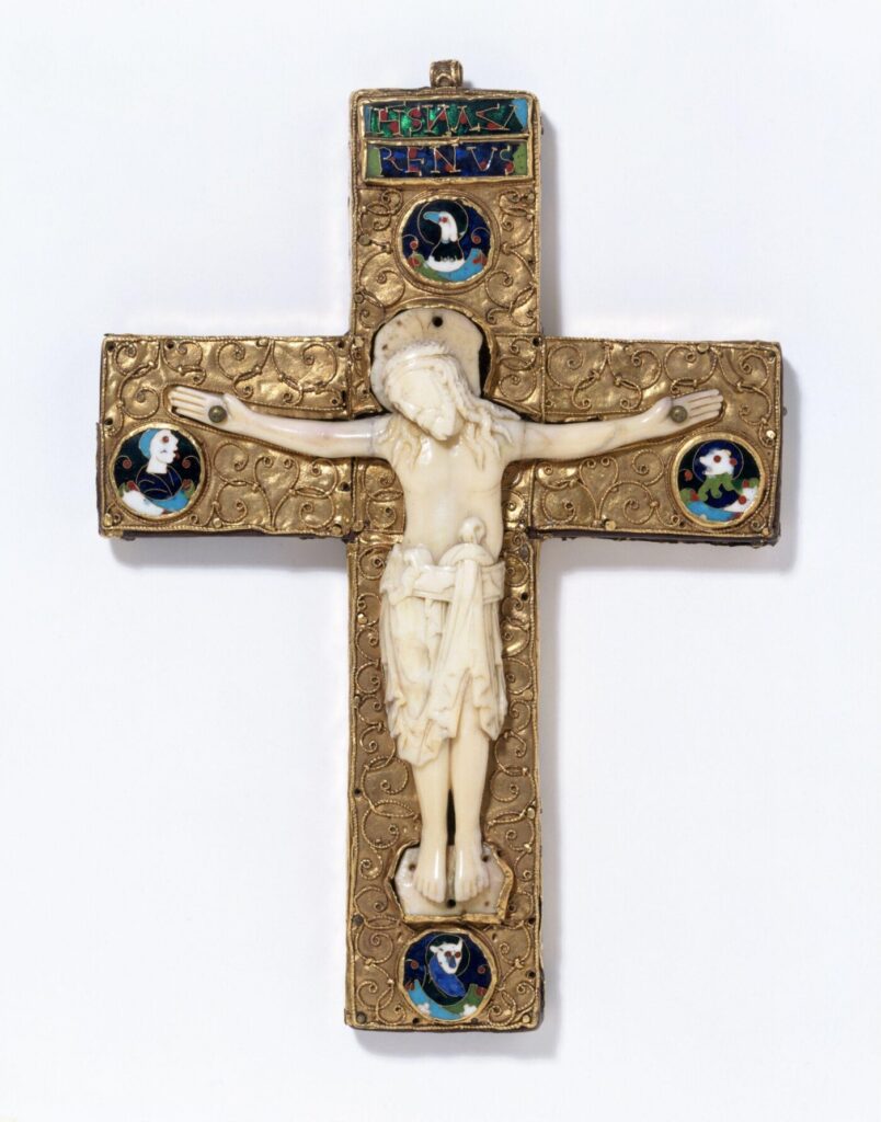 Esemplari di grandissimo valore artistico dell’uso di questo materiale sono il rilievo raffigurante la Deposizione di Cristo, databile intorno al 1200, con una straordinaria e delicata rase del momento in cui Giuseppe d’Arimatea depone il corpo senza vita di Cristo, e la croce di Sibilla contessa delle Fiandre prodotta nella Valle della Mosa prima del 1163. Alla base di questa croce finemente intagliata, c’è una figura femminile prostrata, che alza le mani verso il Cristo crocifisso. L’iscrizione la nomina ‘Sibilla’, che agì come reggente mentre suo marito era in crociata negli anni 1140. Dopo aver visitato Gerusalemme negli anni 1150, Sibilla si rifiutò di tornare a casa con suo marito, entrando invece in un convento appena fuori città. La croce stessa faceva parte della copertina di un evangelario20.