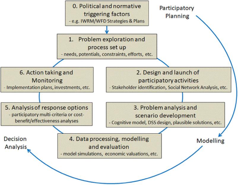 La fase 0 riguarda i fattori scatenanti dell’intero processo. Vengono infatti identificati i fattori istituzionali e normativi – caso specifico – determinanti la necessità di implementare il processo volto ad individuare le opzioni decisionali preferite, come per esempio le prescrizioni di un Piano Nazionale di Adattamento. La fase 1 invece si concentra sull’impostazione del processo e sull’esplorazione del problema decisionale in questione, inclusa la strategia per il coinvolgimento delle parti interessate sin dalle fasi iniziali. A questo punto (fase 2), vengono individuati i principali attori da coinvolgere, come per esempio esperti, policy makers e portatori di interesse in generale, attraverso un’attenta analisi degli stakeholder, come richiesto dalla Direttiva Quadro sulle Acque10, e si iniziano a progettare le attività partecipative che possono essere metodologicamente valide. Attraverso le attività di workshop, viene sviluppato un modello concettuale condiviso e raccolte le preferenze dei singoli attori riguardo le possibili soluzioni, i criteri decisionali e la loro relativa importanza o peso. Il terzo passo dell’approccio (fase 3) si concentra sull’analisi del problema e lo sviluppo di scenari, basandosi sul modello concettuale causale DPSIR11, già citato in precedenza, che permette a decisori e portatori di interesse di esplorare le complesse connessioni tra le attività antropiche multisettoriali e le relative conseguenze sull’ambiente. Nella fase 4, tali conseguenze vengono valutate in maniera dinamica attraverso modelli di valutazione inquadrati all’interno del DPSIR. Ciò porta alla fase 5, nella quale vengono analizzate le soluzioni possibili che permettono di risolvere il problema e, allo stesso tempo, raggiungere gli obiettivi dichiarati. Infine, la fase 6 porta all’implementazione e al monitoraggio degli effetti delle soluzioni adottate. Sono previsti dei cicli interni ogniqualvolta emerga la necessità di rivedere i risultati intermedi, oltre a possibili successivi cicli di iterazione che potrebbero portare all’implementazione della gestione adattiva.