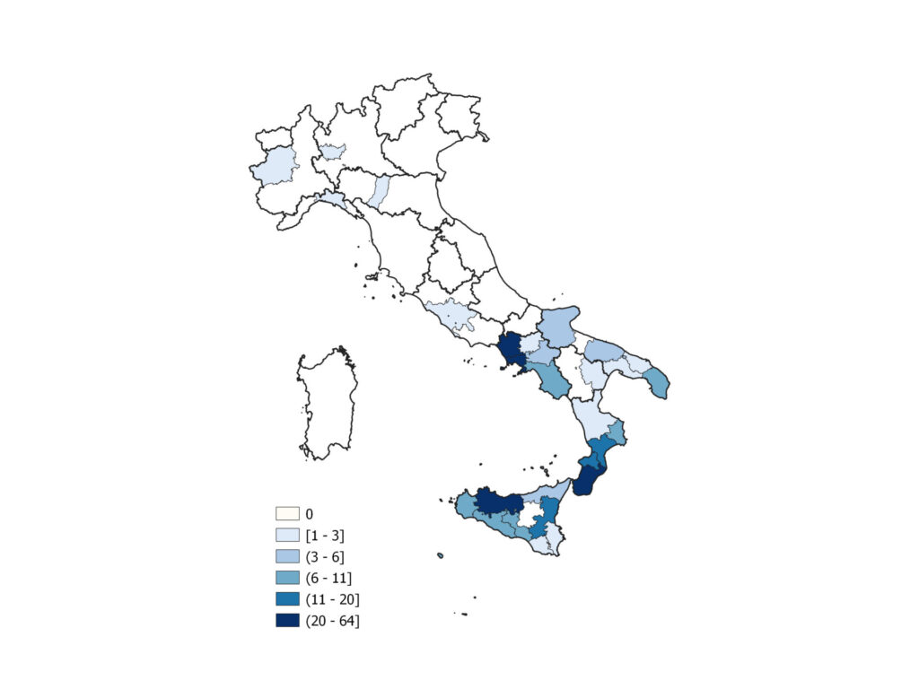 A questo proposito, non è un fatto nuovo che questi fenomeni si manifestino prevalentemente nel Sud dell’Italia. Questa distribuzione è visibile nella figura seguente, che mostra il numero per provincia dal 1991 al 2019 di comuni sciolti per infiltrazione mafiosa. Tuttavia, un recente studio documenta la presenza di imprese sotto l’influenza del crimine organizzato anche in aree senza una tradizione di crimine organizzato, come il Nord-Ovest 3.